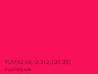 YUV 92.69,-2.312,135.33 Color is a normal rose color and the nearest color is Folly #ff004f. Hex code #f70f58 and RGB value is rgb(247,15,88). In RGB color space, this color is composed of 97% red, 6% green, 35% blue, In CMYK color space, this color is composed of 0% cyan, 94% magenta, 64% yellow , 3% black , In HSL color space, this color has a hue angle of 341° , 94% saturation and 51% lightness.
