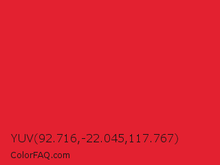 YUV 92.716,-22.045,117.767 Color is a normal red color and the nearest color is Alizarin Crimson #e32636. Hex code #e32130 and RGB value is rgb(227,33,48). In RGB color space, this color is composed of 89% red, 13% green, 19% blue, In CMYK color space, this color is composed of 0% cyan, 85% magenta, 79% yellow , 11% black , In HSL color space, this color has a hue angle of 355° , 78% saturation and 51% lightness.