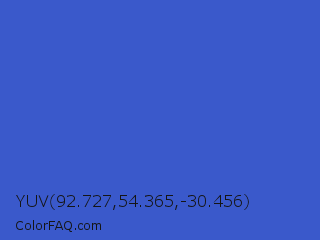 YUV 92.727,54.365,-30.456 Color is a normal blue color and the nearest color is Cerulean Blue #2a52be. Hex code #3a59cb and RGB value is rgb(58,89,203). In RGB color space, this color is composed of 23% red, 35% green, 80% blue, In CMYK color space, this color is composed of 71% cyan, 56% magenta, 0% yellow , 20% black , In HSL color space, this color has a hue angle of 227° , 58% saturation and 51% lightness.