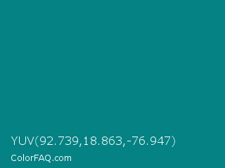 YUV 92.739,18.863,-76.947 Color is a dark cyan color and the nearest color is Teal #008080. Hex code #058283 and RGB value is rgb(5,130,131). In RGB color space, this color is composed of 2% red, 51% green, 51% blue, In CMYK color space, this color is composed of 96% cyan, 1% magenta, 0% yellow , 49% black , In HSL color space, this color has a hue angle of 180° , 93% saturation and 27% lightness.