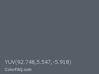 YUV 92.748,5.547,-5.918 Color is a normal blue color and the nearest color is Black Coral #54626f. Hex code #565e68 and RGB value is rgb(86,94,104). In RGB color space, this color is composed of 34% red, 37% green, 41% blue, In CMYK color space, this color is composed of 17% cyan, 10% magenta, 0% yellow , 59% black , In HSL color space, this color has a hue angle of 213° , 9% saturation and 37% lightness.