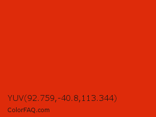 YUV 92.759,-40.8,113.344 Color is a normal red color and the nearest color is Vermilion #d9381e. Hex code #de2b0a and RGB value is rgb(222,43,10). In RGB color space, this color is composed of 87% red, 17% green, 4% blue, In CMYK color space, this color is composed of 0% cyan, 81% magenta, 95% yellow , 13% black , In HSL color space, this color has a hue angle of 9° , 91% saturation and 45% lightness.