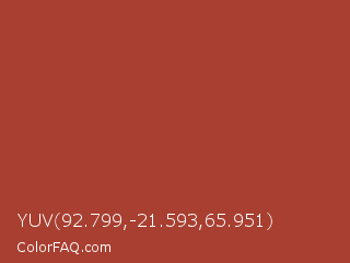 YUV 92.799,-21.593,65.951 Color is a normal red color and the nearest color is Sweet Brown #a83731. Hex code #a83f31 and RGB value is rgb(168,63,49). In RGB color space, this color is composed of 66% red, 25% green, 19% blue, In CMYK color space, this color is composed of 0% cyan, 63% magenta, 71% yellow , 34% black , In HSL color space, this color has a hue angle of 7° , 55% saturation and 43% lightness.