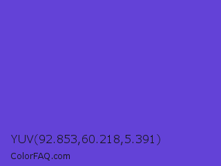 YUV 92.853,60.218,5.391 Color is a normal indigo color and the nearest color is Majorelle Blue #6050dc. Hex code #6342d7 and RGB value is rgb(99,66,215). In RGB color space, this color is composed of 39% red, 26% green, 84% blue, In CMYK color space, this color is composed of 54% cyan, 69% magenta, 0% yellow , 16% black , In HSL color space, this color has a hue angle of 253° , 65% saturation and 55% lightness.
