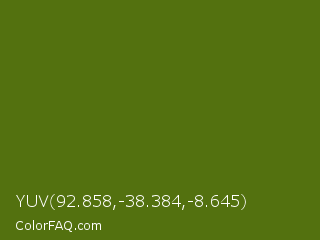 YUV 92.858,-38.384,-8.645 Color is a dark lime color and the nearest color is Green Leaf #436a0d. Hex code #53710f and RGB value is rgb(83,113,15). In RGB color space, this color is composed of 33% red, 44% green, 6% blue, In CMYK color space, this color is composed of 27% cyan, 0% magenta, 87% yellow , 56% black , In HSL color space, this color has a hue angle of 78° , 77% saturation and 25% lightness.