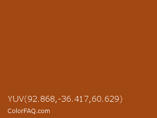 YUV 92.868,-36.417,60.629 Color is a normal orange color and the nearest color is Hawaiian Tan #9d5616. Hex code #a24813 and RGB value is rgb(162,72,19). In RGB color space, this color is composed of 64% red, 28% green, 7% blue, In CMYK color space, this color is composed of 0% cyan, 56% magenta, 88% yellow , 36% black , In HSL color space, this color has a hue angle of 22° , 79% saturation and 35% lightness.