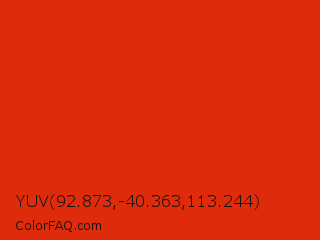 YUV 92.873,-40.363,113.244 Color is a normal red color and the nearest color is Vermilion #d9381e. Hex code #de2b0b and RGB value is rgb(222,43,11). In RGB color space, this color is composed of 87% red, 17% green, 4% blue, In CMYK color space, this color is composed of 0% cyan, 81% magenta, 95% yellow , 13% black , In HSL color space, this color has a hue angle of 9° , 91% saturation and 46% lightness.