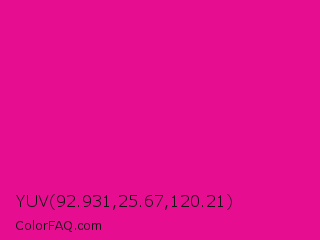YUV 92.931,25.67,120.21 Color is a normal magenta color and the nearest color is Barbie Pink #e0218a. Hex code #e60d91 and RGB value is rgb(230,13,145). In RGB color space, this color is composed of 90% red, 5% green, 57% blue, In CMYK color space, this color is composed of 0% cyan, 94% magenta, 37% yellow , 10% black , In HSL color space, this color has a hue angle of 324° , 89% saturation and 48% lightness.
