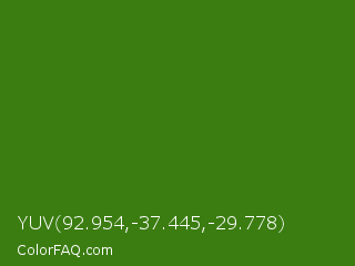 YUV 92.954,-37.445,-29.778 Color is a dark green color and the nearest color is Bilbao #327c14. Hex code #3b7d11 and RGB value is rgb(59,125,17). In RGB color space, this color is composed of 23% red, 49% green, 7% blue, In CMYK color space, this color is composed of 53% cyan, 0% magenta, 86% yellow , 51% black , In HSL color space, this color has a hue angle of 97° , 76% saturation and 28% lightness.