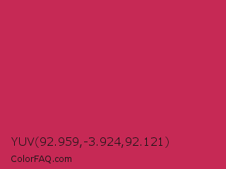 YUV 92.959,-3.924,92.121 Color is a normal rose color and the nearest color is Dingy Dungeon #c53151. Hex code #c62955 and RGB value is rgb(198,41,85). In RGB color space, this color is composed of 78% red, 16% green, 33% blue, In CMYK color space, this color is composed of 0% cyan, 79% magenta, 57% yellow , 22% black , In HSL color space, this color has a hue angle of 343° , 66% saturation and 47% lightness.