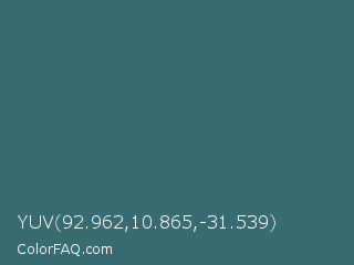 YUV 92.962,10.865,-31.539 Color is a normal cyan color and the nearest color is William #3a686c. Hex code #396b73 and RGB value is rgb(57,107,115). In RGB color space, this color is composed of 22% red, 42% green, 45% blue, In CMYK color space, this color is composed of 50% cyan, 7% magenta, 0% yellow , 55% black , In HSL color space, this color has a hue angle of 188° , 34% saturation and 34% lightness.