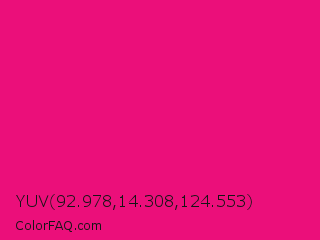 YUV 92.978,14.308,124.553 Color is a normal rose color and the nearest color is Red Purple #e40078. Hex code #eb0f7a and RGB value is rgb(235,15,122). In RGB color space, this color is composed of 92% red, 6% green, 48% blue, In CMYK color space, this color is composed of 0% cyan, 94% magenta, 48% yellow , 8% black , In HSL color space, this color has a hue angle of 331° , 88% saturation and 49% lightness.