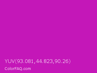 YUV 93.081,44.823,90.26 Color is a normal magenta color and the nearest color is Deep Magenta #cc00cc. Hex code #c417b8 and RGB value is rgb(196,23,184). In RGB color space, this color is composed of 77% red, 9% green, 72% blue, In CMYK color space, this color is composed of 0% cyan, 88% magenta, 6% yellow , 23% black , In HSL color space, this color has a hue angle of 304° , 79% saturation and 43% lightness.