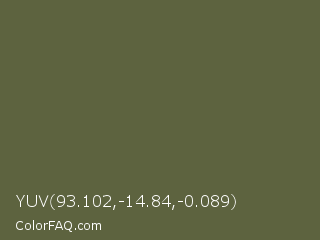 YUV 93.102,-14.84,-0.089 Color is a normal yellow color and the nearest color is Hemlock #5e5d3b. Hex code #5d633f and RGB value is rgb(93,99,63). In RGB color space, this color is composed of 36% red, 39% green, 25% blue, In CMYK color space, this color is composed of 6% cyan, 0% magenta, 36% yellow , 61% black , In HSL color space, this color has a hue angle of 70° , 22% saturation and 32% lightness.