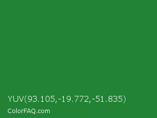 YUV 93.105,-19.772,-51.835 Color is a normal green color and the nearest color is Forest Green #228b22. Hex code #228335 and RGB value is rgb(34,131,53). In RGB color space, this color is composed of 13% red, 51% green, 21% blue, In CMYK color space, this color is composed of 74% cyan, 0% magenta, 60% yellow , 49% black , In HSL color space, this color has a hue angle of 132° , 59% saturation and 32% lightness.