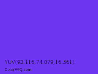 YUV 93.116,74.879,16.561 Color is a normal indigo color and the nearest color is Blue Violet #8a2be2. Hex code #7036f5 and RGB value is rgb(112,54,245). In RGB color space, this color is composed of 44% red, 21% green, 96% blue, In CMYK color space, this color is composed of 54% cyan, 78% magenta, 0% yellow , 4% black , In HSL color space, this color has a hue angle of 258° , 91% saturation and 59% lightness.