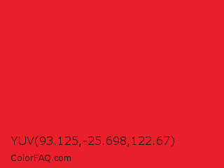 YUV 93.125,-25.698,122.67 Color is a normal red color and the nearest color is Red Pigment #ed1c24. Hex code #e92029 and RGB value is rgb(233,32,41). In RGB color space, this color is composed of 91% red, 13% green, 16% blue, In CMYK color space, this color is composed of 0% cyan, 86% magenta, 82% yellow , 9% black , In HSL color space, this color has a hue angle of 357° , 82% saturation and 52% lightness.