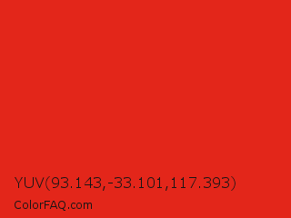 YUV 93.143,-33.101,117.393 Color is a normal red color and the nearest color is Lust #e62020. Hex code #e3261a and RGB value is rgb(227,38,26). In RGB color space, this color is composed of 89% red, 15% green, 10% blue, In CMYK color space, this color is composed of 0% cyan, 83% magenta, 89% yellow , 11% black , In HSL color space, this color has a hue angle of 4° , 79% saturation and 50% lightness.