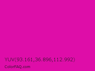 YUV 93.161,36.896,112.992 Color is a normal magenta color and the nearest color is Hollywood Cerise #f400a1. Hex code #de0da8 and RGB value is rgb(222,13,168). In RGB color space, this color is composed of 87% red, 5% green, 66% blue, In CMYK color space, this color is composed of 0% cyan, 94% magenta, 24% yellow , 13% black , In HSL color space, this color has a hue angle of 316° , 89% saturation and 46% lightness.