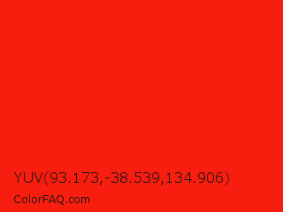 YUV 93.173,-38.539,134.906 Color is a normal red color and the nearest color is Red RYB #fe2712. Hex code #f71e0f and RGB value is rgb(247,30,15). In RGB color space, this color is composed of 97% red, 12% green, 6% blue, In CMYK color space, this color is composed of 0% cyan, 88% magenta, 94% yellow , 3% black , In HSL color space, this color has a hue angle of 4° , 94% saturation and 51% lightness.
