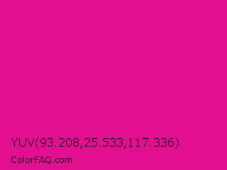 YUV 93.208,25.533,117.336 Color is a normal magenta color and the nearest color is Barbie Pink #e0218a. Hex code #e30f91 and RGB value is rgb(227,15,145). In RGB color space, this color is composed of 89% red, 6% green, 57% blue, In CMYK color space, this color is composed of 0% cyan, 93% magenta, 36% yellow , 11% black , In HSL color space, this color has a hue angle of 323° , 88% saturation and 47% lightness.