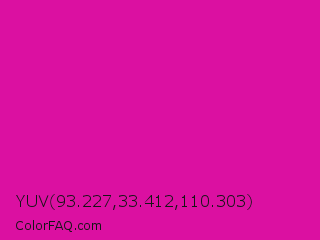 YUV 93.227,33.412,110.303 Color is a normal magenta color and the nearest color is Barbie Pink #e0218a. Hex code #db10a1 and RGB value is rgb(219,16,161). In RGB color space, this color is composed of 86% red, 6% green, 63% blue, In CMYK color space, this color is composed of 0% cyan, 93% magenta, 26% yellow , 14% black , In HSL color space, this color has a hue angle of 317° , 86% saturation and 46% lightness.