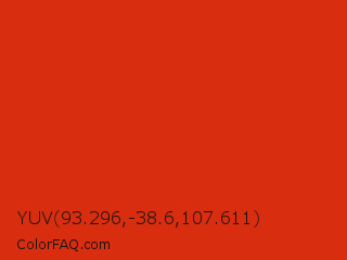 YUV 93.296,-38.6,107.611 Color is a normal red color and the nearest color is Vermilion #d9381e. Hex code #d82e0f and RGB value is rgb(216,46,15). In RGB color space, this color is composed of 85% red, 18% green, 6% blue, In CMYK color space, this color is composed of 0% cyan, 79% magenta, 93% yellow , 15% black , In HSL color space, this color has a hue angle of 9° , 87% saturation and 45% lightness.