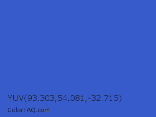 YUV 93.303,54.081,-32.715 Color is a normal blue color and the nearest color is Cerulean Blue #2a52be. Hex code #385bcb and RGB value is rgb(56,91,203). In RGB color space, this color is composed of 22% red, 36% green, 80% blue, In CMYK color space, this color is composed of 72% cyan, 55% magenta, 0% yellow , 20% black , In HSL color space, this color has a hue angle of 226° , 59% saturation and 51% lightness.