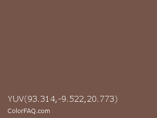 YUV 93.314,-9.522,20.773 Color is a normal color and the nearest color is Roman Coffee #795d4c. Hex code #75554a and RGB value is rgb(117,85,74). In RGB color space, this color is composed of 46% red, 33% green, 29% blue, In CMYK color space, this color is composed of 0% cyan, 27% magenta, 37% yellow , 54% black , In HSL color space, this color has a hue angle of 15° , 23% saturation and 37% lightness.
