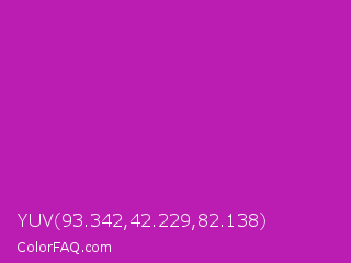 YUV 93.342,42.229,82.138 Color is a normal magenta color and the nearest color is Byzantine #bd33a4. Hex code #bb1db3 and RGB value is rgb(187,29,179). In RGB color space, this color is composed of 73% red, 11% green, 70% blue, In CMYK color space, this color is composed of 0% cyan, 84% magenta, 4% yellow , 27% black , In HSL color space, this color has a hue angle of 303° , 73% saturation and 42% lightness.