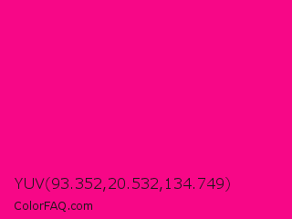 YUV 93.352,20.532,134.749 Color is a normal rose color and the nearest color is Rose #ff007f. Hex code #f70787 and RGB value is rgb(247,7,135). In RGB color space, this color is composed of 97% red, 3% green, 53% blue, In CMYK color space, this color is composed of 0% cyan, 97% magenta, 45% yellow , 3% black , In HSL color space, this color has a hue angle of 328° , 94% saturation and 50% lightness.
