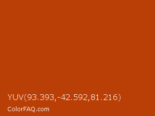 YUV 93.393,-42.592,81.216 Color is a normal orange color and the nearest color is Rock Spray #ba450c. Hex code #ba3f07 and RGB value is rgb(186,63,7). In RGB color space, this color is composed of 73% red, 25% green, 3% blue, In CMYK color space, this color is composed of 0% cyan, 66% magenta, 96% yellow , 27% black , In HSL color space, this color has a hue angle of 19° , 93% saturation and 38% lightness.