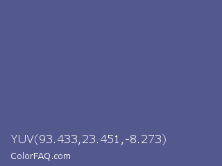 YUV 93.433,23.451,-8.273 Color is a normal blue color and the nearest color is Purple Navy #4e5180. Hex code #54598d and RGB value is rgb(84,89,141). In RGB color space, this color is composed of 33% red, 35% green, 55% blue, In CMYK color space, this color is composed of 40% cyan, 37% magenta, 0% yellow , 45% black , In HSL color space, this color has a hue angle of 235° , 25% saturation and 44% lightness.