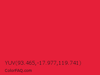 YUV 93.465,-17.977,119.741 Color is a normal red color and the nearest color is Alizarin Crimson #e32636. Hex code #e61f39 and RGB value is rgb(230,31,57). In RGB color space, this color is composed of 90% red, 12% green, 22% blue, In CMYK color space, this color is composed of 0% cyan, 87% magenta, 75% yellow , 10% black , In HSL color space, this color has a hue angle of 352° , 80% saturation and 51% lightness.