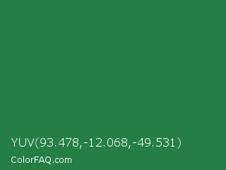 YUV 93.478,-12.068,-49.531 Color is a normal green color and the nearest color is Dark Spring Green #177245. Hex code #257f45 and RGB value is rgb(37,127,69). In RGB color space, this color is composed of 15% red, 50% green, 27% blue, In CMYK color space, this color is composed of 71% cyan, 0% magenta, 46% yellow , 50% black , In HSL color space, this color has a hue angle of 141° , 55% saturation and 32% lightness.