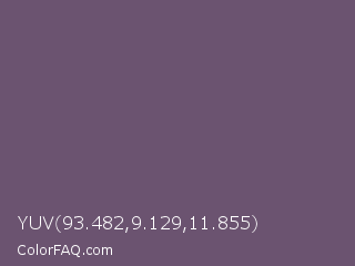 YUV 93.482,9.129,11.855 Color is a normal purple color and the nearest color is Salt Box #685e6e. Hex code #6b5370 and RGB value is rgb(107,83,112). In RGB color space, this color is composed of 42% red, 33% green, 44% blue, In CMYK color space, this color is composed of 4% cyan, 26% magenta, 0% yellow , 56% black , In HSL color space, this color has a hue angle of 290° , 15% saturation and 38% lightness.
