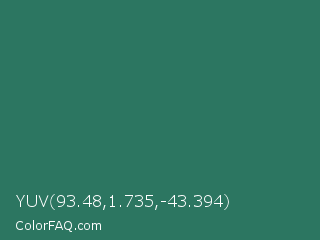 YUV 93.48,1.735,-43.394 Color is a normal green color and the nearest color is Amazon #3b7a57. Hex code #2c7661 and RGB value is rgb(44,118,97). In RGB color space, this color is composed of 17% red, 46% green, 38% blue, In CMYK color space, this color is composed of 63% cyan, 0% magenta, 18% yellow , 54% black , In HSL color space, this color has a hue angle of 163° , 46% saturation and 32% lightness.