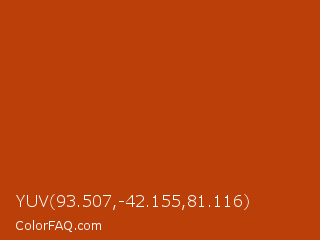 YUV 93.507,-42.155,81.116 Color is a normal orange color and the nearest color is Rust #b7410e. Hex code #ba3f08 and RGB value is rgb(186,63,8). In RGB color space, this color is composed of 73% red, 25% green, 3% blue, In CMYK color space, this color is composed of 0% cyan, 66% magenta, 96% yellow , 27% black , In HSL color space, this color has a hue angle of 19° , 92% saturation and 38% lightness.