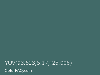 YUV 93.513,5.17,-25.006 Color is a normal cyan color and the nearest color is William #3a686c. Hex code #416a68 and RGB value is rgb(65,106,104). In RGB color space, this color is composed of 25% red, 42% green, 41% blue, In CMYK color space, this color is composed of 39% cyan, 0% magenta, 2% yellow , 58% black , In HSL color space, this color has a hue angle of 177° , 24% saturation and 34% lightness.