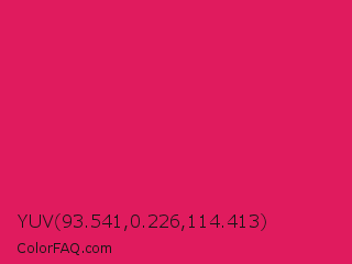 YUV 93.541,0.226,114.413 Color is a normal rose color and the nearest color is Ruby #e0115f. Hex code #e01b5e and RGB value is rgb(224,27,94). In RGB color space, this color is composed of 88% red, 11% green, 37% blue, In CMYK color space, this color is composed of 0% cyan, 88% magenta, 58% yellow , 12% black , In HSL color space, this color has a hue angle of 340° , 78% saturation and 49% lightness.