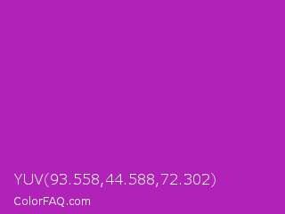 YUV 93.558,44.588,72.302 Color is a normal magenta color and the nearest color is Byzantine #bd33a4. Hex code #b022b8 and RGB value is rgb(176,34,184). In RGB color space, this color is composed of 69% red, 13% green, 72% blue, In CMYK color space, this color is composed of 4% cyan, 82% magenta, 0% yellow , 28% black , In HSL color space, this color has a hue angle of 297° , 69% saturation and 43% lightness.