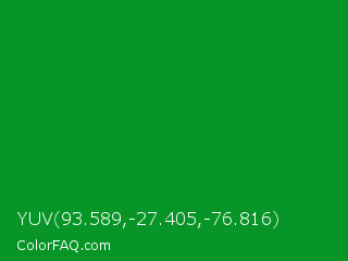 YUV 93.589,-27.405,-76.816 Color is a dark green color and the nearest color is North Texas Green #059033. Hex code #069526 and RGB value is rgb(6,149,38). In RGB color space, this color is composed of 2% red, 58% green, 15% blue, In CMYK color space, this color is composed of 96% cyan, 0% magenta, 74% yellow , 42% black , In HSL color space, this color has a hue angle of 133° , 92% saturation and 30% lightness.
