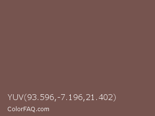 YUV 93.596,-7.196,21.402 Color is a normal red color and the nearest color is Ferra #704f50. Hex code #76544f and RGB value is rgb(118,84,79). In RGB color space, this color is composed of 46% red, 33% green, 31% blue, In CMYK color space, this color is composed of 0% cyan, 29% magenta, 33% yellow , 54% black , In HSL color space, this color has a hue angle of 8° , 20% saturation and 39% lightness.
