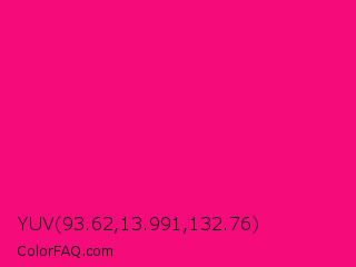 YUV 93.62,13.991,132.76 Color is a normal rose color and the nearest color is Winter Sky #ff007c. Hex code #f50b7a and RGB value is rgb(245,11,122). In RGB color space, this color is composed of 96% red, 4% green, 48% blue, In CMYK color space, this color is composed of 0% cyan, 96% magenta, 50% yellow , 4% black , In HSL color space, this color has a hue angle of 332° , 92% saturation and 50% lightness.