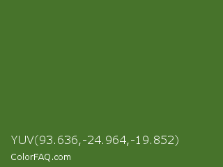 YUV 93.636,-24.964,-19.852 Color is a normal green color and the nearest color is Sap Green #507d2a. Hex code #47732b and RGB value is rgb(71,115,43). In RGB color space, this color is composed of 28% red, 45% green, 17% blue, In CMYK color space, this color is composed of 38% cyan, 0% magenta, 63% yellow , 55% black , In HSL color space, this color has a hue angle of 97° , 46% saturation and 31% lightness.
