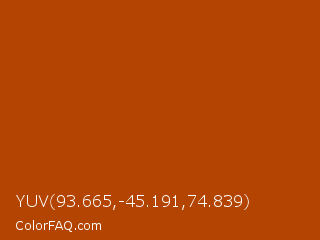 YUV 93.665,-45.191,74.839 Color is a normal orange color and the nearest color is Fire #aa4203. Hex code #b34402 and RGB value is rgb(179,68,2). In RGB color space, this color is composed of 70% red, 27% green, 1% blue, In CMYK color space, this color is composed of 0% cyan, 62% magenta, 99% yellow , 30% black , In HSL color space, this color has a hue angle of 22° , 98% saturation and 35% lightness.