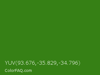 YUV 93.676,-35.829,-34.796 Color is a dark green color and the nearest color is Bilbao #327c14. Hex code #368015 and RGB value is rgb(54,128,21). In RGB color space, this color is composed of 21% red, 50% green, 8% blue, In CMYK color space, this color is composed of 58% cyan, 0% magenta, 84% yellow , 50% black , In HSL color space, this color has a hue angle of 101° , 72% saturation and 29% lightness.