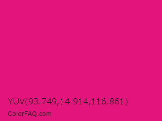 YUV 93.749,14.914,116.861 Color is a normal rose color and the nearest color is Vivid Cerise #da1d81. Hex code #e3147c and RGB value is rgb(227,20,124). In RGB color space, this color is composed of 89% red, 8% green, 49% blue, In CMYK color space, this color is composed of 0% cyan, 91% magenta, 45% yellow , 11% black , In HSL color space, this color has a hue angle of 330° , 84% saturation and 48% lightness.