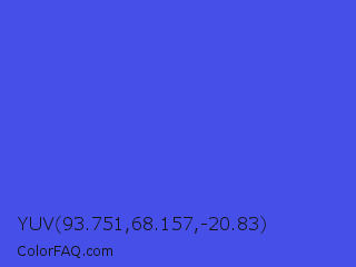YUV 93.751,68.157,-20.83 Color is a normal blue color and the nearest color is Ultramarine Blue #4166f5. Hex code #464fe8 and RGB value is rgb(70,79,232). In RGB color space, this color is composed of 27% red, 31% green, 91% blue, In CMYK color space, this color is composed of 70% cyan, 66% magenta, 0% yellow , 9% black , In HSL color space, this color has a hue angle of 237° , 78% saturation and 59% lightness.