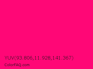 YUV 93.806,11.928,141.367 Color is a normal rose color and the nearest color is Winter Sky #ff007c. Hex code #ff0776 and RGB value is rgb(255,7,118). In RGB color space, this color is composed of 100% red, 3% green, 46% blue, In CMYK color space, this color is composed of 0% cyan, 97% magenta, 54% yellow , 0% black , In HSL color space, this color has a hue angle of 333° , 100% saturation and 51% lightness.